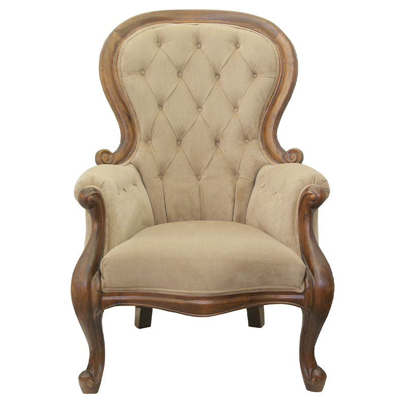 Кресло с мягкой обивкой из светло-коричневого велюра на 4-х деревянных ножках Evelyn Classical Armchair