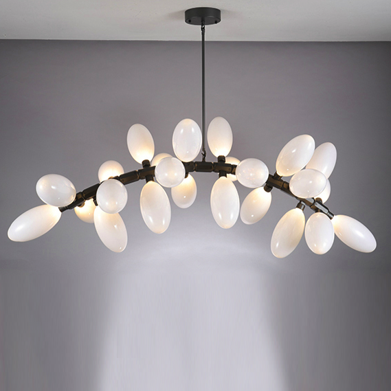 Каждая люстра состоит из большого количества плафонов нанизанных на алюминиевые подвижные позвонки. Что дает возможность видоизменять люстру, давать ей естественное ниспадание. Каждый плафон выдувается вручную - что дает особенное, в полном смысле этого слова, неповторимое,  изящество.